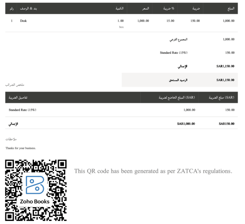 Zoho Books支撑处置分歧国度和地域的税收轨制,包罗报税表格、演讲和满脚各地税务要求的功能。这对于确保企业正在国际营业中的税务合规性至关主要。能够帮帮企业正在削减人力成本的同时,快速适该当地市场的法令律例。例如下图,Zoho Books支撑生成合适沙特律例的电子。